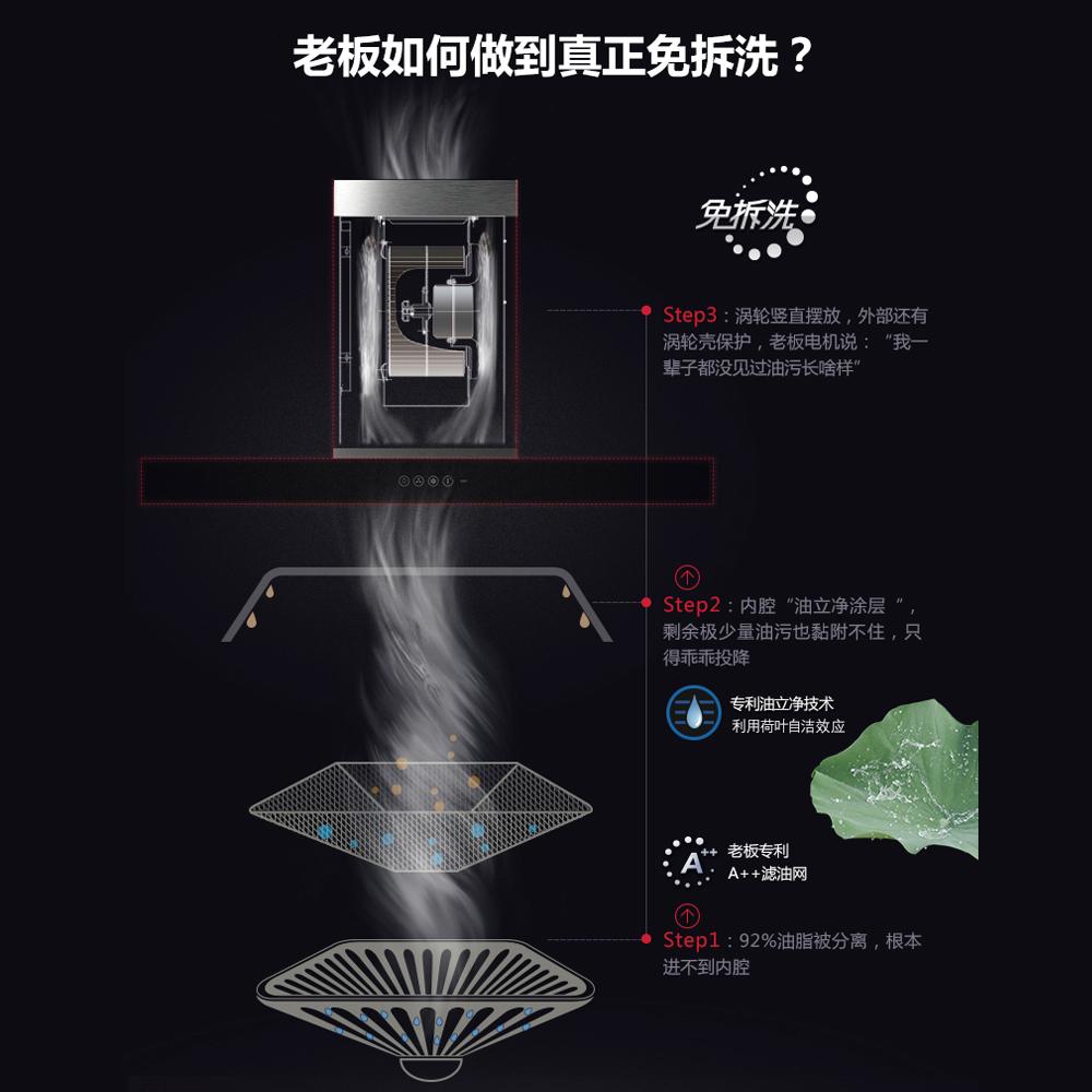 - 老板始终坚持高品质厨电 用料上未曾轻心 从外表的医用304不锈钢 LED冷光照明灯 智能触控按键 到内部的强劲马达 全钢涡轮独创 三片立体增压板 用心守护着每一个家庭