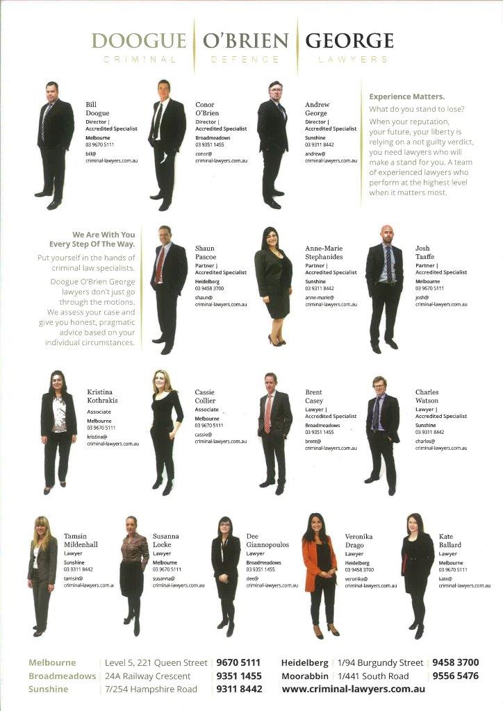 墨尔本刑事法律师 -杜哥.欧布莱恩.乔治公司。我们是澳大利亚最著名的专业刑事法(交通事故,酒后驾驶,欺诈,毒品事宜,等等)律师事务所。公司在墨尔本市中心,有国家笔译口译认证局三级翻译人员,可以帮助你预约以及出席法庭。
