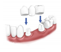 Bridges, and Dentures These are potential treatment options for patients who have lost teeth. You are best to speak to one of our dentists in relation to what treatment is best for you. A simple explanation of these treatments follows. A bridge uses neighbouring teeth to anchor off and replace the missing teeth. A denture is a removable appliance that is held in place via clasps on remaining teeth for a partial denture, or held via suction in the case of a full denture. An implant requires a permanent post be inserted into the jaw, to which a crown or other appliance may be affixed. The prices associated with these treatments vary widely and may not be suitable for every patient. |