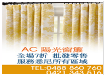 二十年经验,卷帘,垂直帘,木百叶,Shutter,各款布帘,罗马帘,铝合金,纱窗,纱门,防盗门,awnings遮阳棚 代客安装窗帘轨道, 全场七折,批发零售 服务悉尼所有区域 0488860760 0421343516 持008 会员卡, 部分产品 可以享受 50% 的优惠联系我时请说明是在澳洲华人黄页 Chinesepage.com.au | 008.com.au看到的,谢谢!